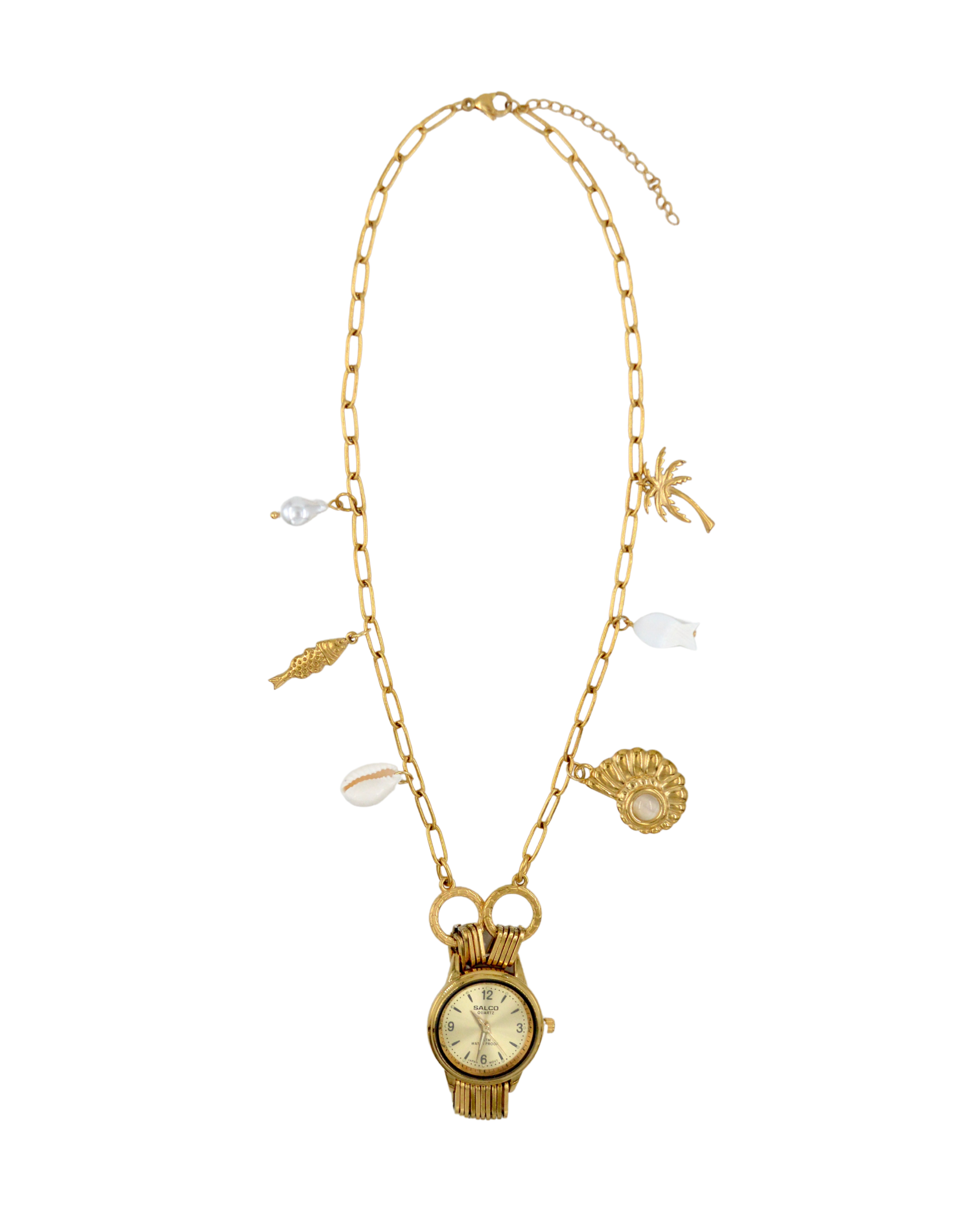 collar reloj pieza única, hecho con cadena, dijes de acero inoxidable y plástico.