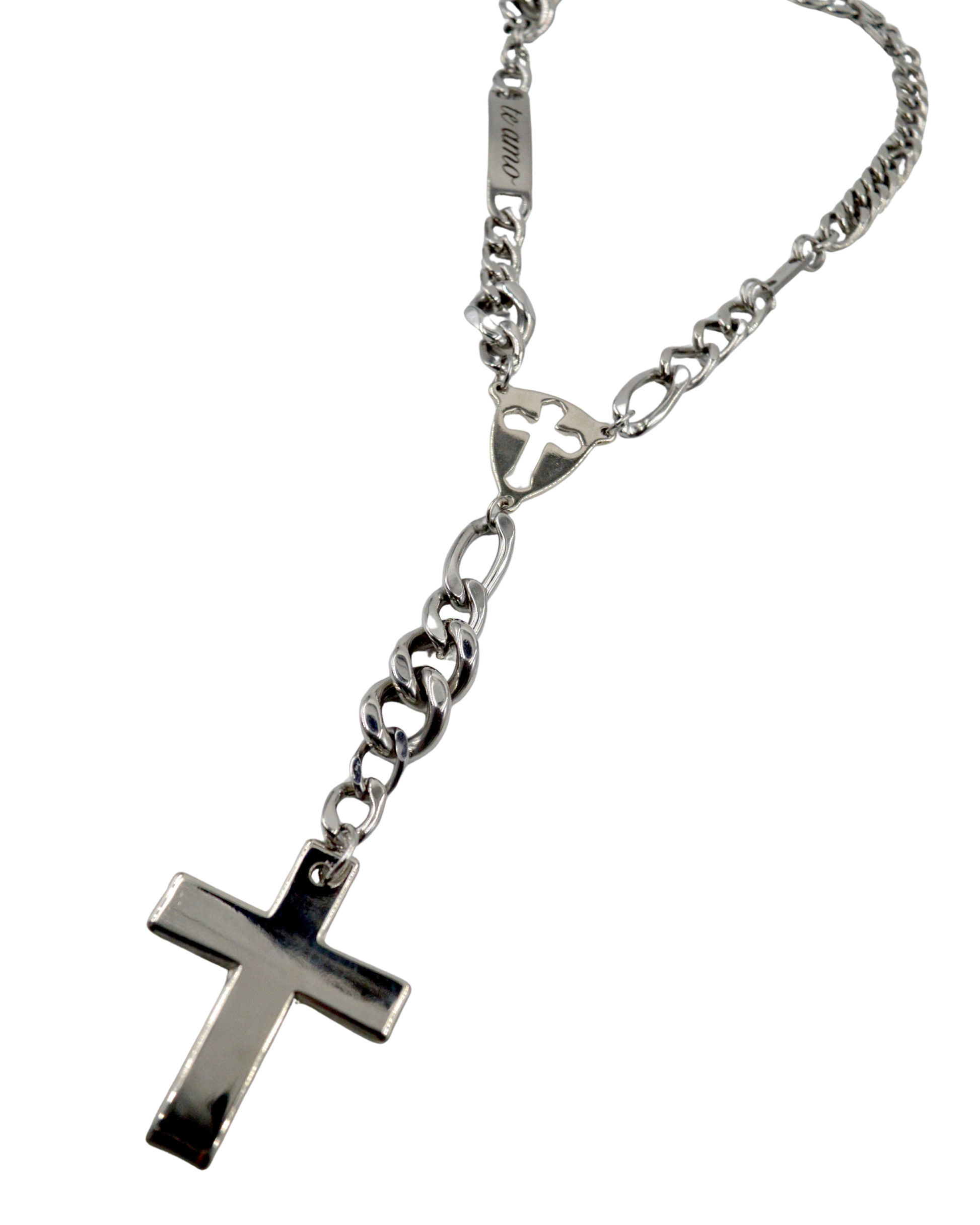 rosario pieza única, hecho con dijes y cadena de acero inoxidable.